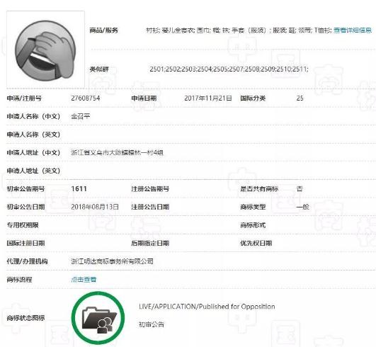 從初審公告上我們可以看到,「捂臉」表情注冊的只是服裝鞋帽等25類(lèi)商品,我們知道,商標分類(lèi)注冊是按核定圖樣核定使用商品保護。