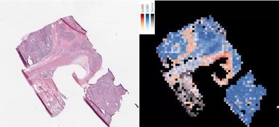 ▲上圖為 AI 模型從癌變組織圖像中識別兩種肺癌類(lèi)型的示意圖。其中左圖為原始圖像,右圖為 AI 輸出的肺癌類(lèi)型圖譜。右圖中的紅色部分為鱗狀細胞癌,藍色部分為肺鱗狀細胞癌,灰色部分為正常肺部組織(圖片來(lái)源:NYU School of Medicine)