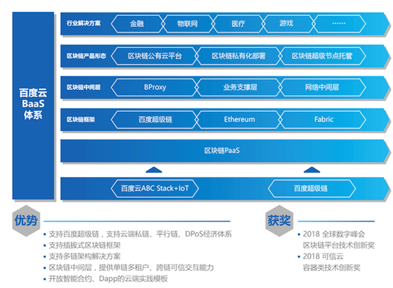 在突破技術(shù)瓶頸的基礎上,百度云區塊鏈定位于云端一站式區塊鏈賦能中心,為企業(yè)用戶(hù)提供開(kāi)箱即用的區塊鏈技術(shù)和產(chǎn)品能力。目前,百度云已打造集底層技術(shù)及框架、中間層、產(chǎn)品層和上層解決方案于一體的百度云 BaaS(BlockChain as a Service)服務(wù)體系。該體系以 AI+ 區塊鏈、IoT+ 區塊鏈等技術(shù)創(chuàng )新和 XuperChain 為技術(shù)基礎,融合百度超級鏈、Ethereum 和 Fabric 為核心技術(shù)框架,區塊鏈中間層及區塊鏈公有云平臺、私有化部署及超級節點(diǎn)托管等多樣化產(chǎn)品形態(tài),同時(shí)面向金融、物聯(lián)網(wǎng)、醫療、游戲等垂直行業(yè)輸出一站式區塊鏈解決方案。