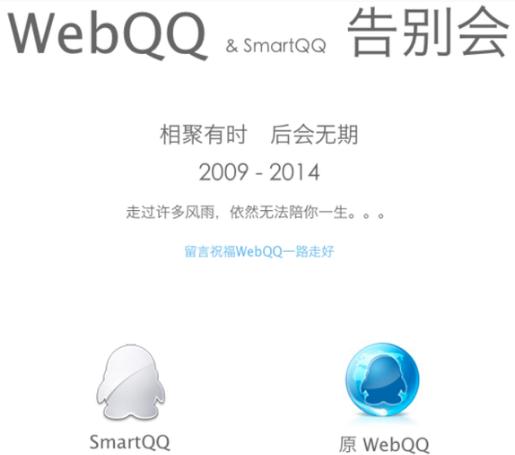 到 2014 年 9 月,WebQQ 官網(wǎng)掛出公告,顯示“相聚有時(shí),后會(huì )無(wú)期”,“2009-2014”,并提示網(wǎng)友“留言祝福 WebQQ 一路走好”。
