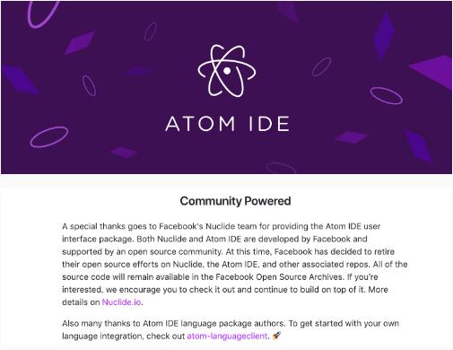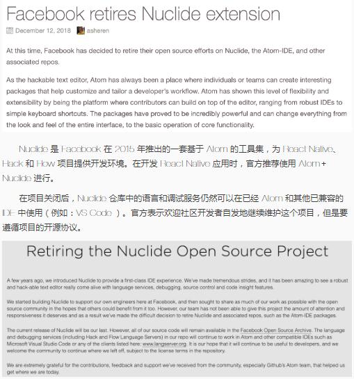 Facebook 12 月 12 日宣布,由于開(kāi)發(fā)團隊精力有限,后續將停止維護 Nuclide、Atom-IDE 和其他相關(guān)開(kāi)源庫。項目現有源碼將繼續保留在 Facebook 開(kāi)源存檔倉庫中。