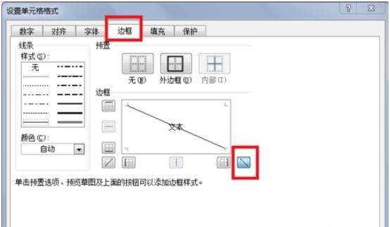 在彈出的“設置單元格格式”的設置頁(yè),找到“邊框”,點(diǎn)擊右下角的斜線(xiàn),確定,即可在單元格內插入斜線(xiàn),如下圖所示: