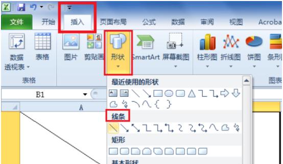 在excel軟件主界面,切換到“插入”選項卡下, 選擇“形狀”-“線(xiàn)條”,在其中找到你需要的斜線(xiàn)的樣式,一般都是普通直線(xiàn),如下圖所示: