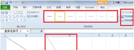 選擇直線(xiàn)確定后,直接在要插入斜線(xiàn)的單元格內畫(huà)線(xiàn)即可,并可以選擇“形狀輪廓”和“形狀效果”,如下圖所示: