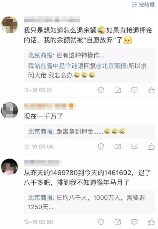 但追問(wèn)到底最晚什么時(shí)候能退時(shí),工作人員卻表示無(wú)法確定,并解釋稱(chēng) 18 日開(kāi)始線(xiàn)上排隊退押金。每天零點(diǎn)都會(huì )退一批人,剩下的人則會(huì )順延到前面。