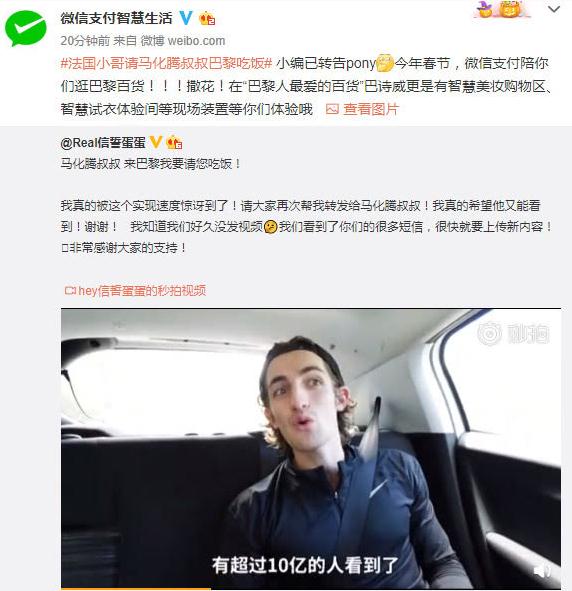 1 月 24 日消息,去年一個(gè)法國小哥@Real 信誓蛋蛋的視頻在微博上刷屏,該法國小哥希望微信支付能去拯救落后的法國。今天他再發(fā)微博稱(chēng),法國現在已能實(shí)現微信支付,還表示如果馬化騰來(lái)巴黎要請他吃飯!