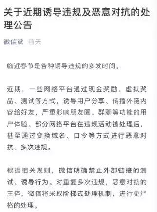 《公告》指出,此類(lèi)行為嚴重影響朋友圈、群聊等功能的用戶(hù)體驗。根據相關(guān)規則,微信明確禁止外部鏈接的測試、誘導行為。對重復多次違規,惡意對抗的主體,微信將采取階梯式處理機制,進(jìn)行更嚴格的處理。