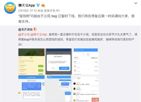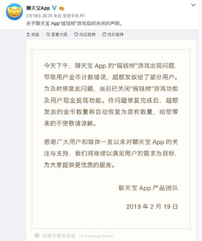 隨后,聊天寶 App 官方微博發(fā)布聲明,稱(chēng)聊天寶 App 的“搖錢(qián)樹(shù)”游戲出現問(wèn)題,導致用戶(hù)金幣計數錯誤,超額發(fā)放給了部分用戶(hù)。為及時(shí)修復此問(wèn)題,當前已關(guān)閉“搖錢(qián)樹(shù)”游戲功能及用戶(hù)現金提現功能。待問(wèn)題修復完成后,超額發(fā)放的金幣數量將自動(dòng)恢復為原有數量。