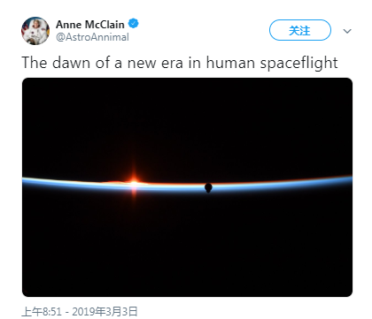 據外媒 Cnet 報道,美國宇航局(NASA)宇航員 Anne McClain 周日在 Twitter 上發(fā)布了一張令人嘆為觀(guān)止的圖像,并配文稱(chēng):“人類(lèi)太空飛行新時(shí)代的曙光。”這張圖像是在 SpaceX 載人龍飛船 Demo-1 首次接近國際空間站進(jìn)行對接時(shí)所拍攝的,展示了這個(gè)創(chuàng )造歷史的測試任務(wù)。