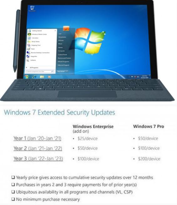 微軟現已宣布將從 2019 年 4 月 1 日開(kāi)始銷(xiāo)售 Windows 7 擴展安全更新,價(jià)格清單如下所示,最低 25 美元一臺,Windows 7 ESU 將按設備銷(xiāo)售,每年的價(jià)格將翻倍。在 2020 年 1 月 14 日之后,微軟將不再為運行 Windows 7 的 PC 提供安全更新或支持。