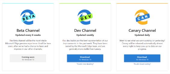 Dev 與 Canary build 都是開(kāi)發(fā)者預覽版,同屬于 Microsoft Edge Insider Channels,此外還有一個(gè) Beta build。微軟介紹,Canary 頻道每天都會(huì )更新,而 Dev 頻道每周更新,Beta 頻道還沒(méi)釋放,它將保持 6 周一更新。每個(gè)頻道有各個(gè)的圖標與名稱(chēng),開(kāi)發(fā)者可以同時(shí)安裝多個(gè)頻道版本進(jìn)行測試。官方會(huì )根據用戶(hù)反饋、自動(dòng)化測試結果、性能指標和遙測等數據將 Canary 構建版本推到 Dev 頻道,之后推到 Beta 頻道,直到最終發(fā)布成為 Stable 版本。