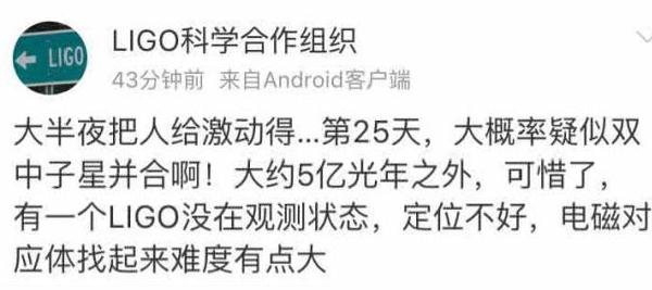 據“LIGO 科學(xué)合作組織”微博透露,科學(xué)家大概率再次探測到雙中子星碰撞產(chǎn)生的引力波,這次波源距離地球 5 億光年。另外,我們詢(xún)問(wèn)了引力波領(lǐng)域的一線(xiàn)科學(xué)家,都表示探測到了這樣一個(gè)引力波事件,但對于波源的具體參數都還沒(méi)有得到細節信息。
