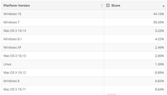 在非 Windows 平臺上,macOS 10.14 占有率小幅下滑,從 5.40% 下降至 5.23%。