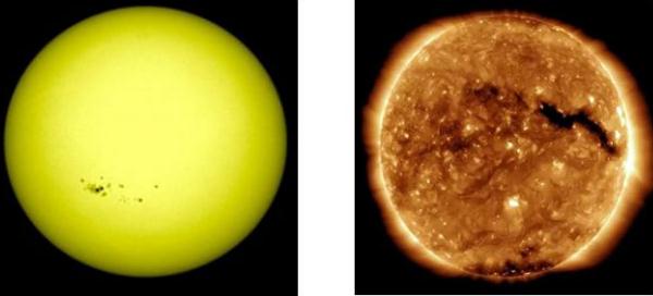 太陽(yáng)大氣從里往外,依溫度變化可以劃分為光球、色球、日冕。我們肉眼看到的明亮的日輪就是光球,其厚度不過(guò)幾百千米,溫度約 6000 度。日冕是太陽(yáng)大氣的最外層,厚度達到幾百萬(wàn)公里以上;溫度比光球高三個(gè)量級,密度則低七個(gè)量級;它的亮度僅為光球的百萬(wàn)分之一。