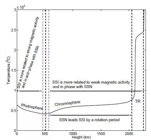 他們發(fā)現,在低光球層(標準太陽(yáng)大氣模型中的溫度正常下降層),色散的太陽(yáng)光與大尺度磁活動(dòng)呈反相關(guān)關(guān)系,且相對于小尺度磁活動(dòng),與大尺度磁活動(dòng)更相關(guān)聯(lián);在高光球及之上(標準太陽(yáng)大氣模型中的溫度反常增加層),色散的太陽(yáng)光與大尺度磁活動(dòng)呈正相關(guān)關(guān)系,且相對于大尺度磁活動(dòng),與小尺度磁活動(dòng)更相關(guān)聯(lián)。