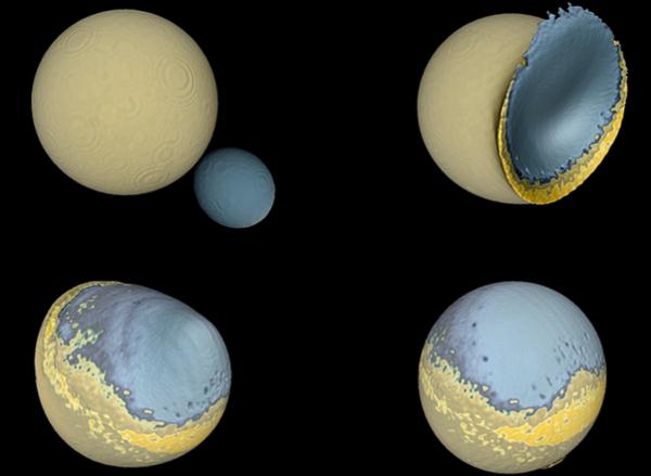 圖說(shuō):月球是如何形成的:模擬的原始月球和另一顆地球衛星之間的碰撞顯示,碰撞后二者質(zhì)量嵌合在一起,產(chǎn)生了不對稱(chēng)的半球。淺藍色表示月球地殼、深藍色為月球地幔,黃色為一層上地幔物質(zhì),代表了熔巖組成的“海洋”。另一顆衛星的大部分都以薄層堆積起來(lái),形成了類(lèi)似月球背面高地的山區。