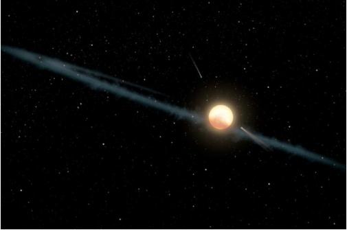 現在因距離恒星更近,這個(gè)結冰,塵土飛揚的流亡系外衛星將開(kāi)始接收比平時(shí)更多的輻射,融化其外層。這些層將流向太空,像彗星一樣在它后面留下痕跡。最終,較大的塊和較小的顆??梢栽诤阈侵?chē)纬森h(huán),這將以零星的間隔和不同的深度阻擋光。