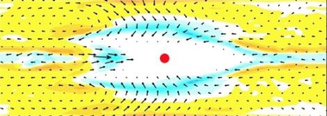 海冰流動(dòng)(箭頭)、海冰生長(cháng)對應的放熱(黃色)和海冰融化對應的吸熱(藍色)。紅色點(diǎn)為星下點(diǎn)位置,橫軸為經(jīng)度(0-360),縱軸為緯度(90S-90N)。