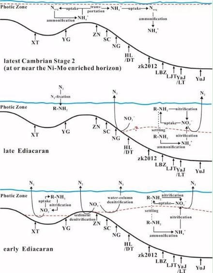 到了寒武紀第二期末期鎳鉬多金屬層附近,華南氮同位素值下降到最低,結合沉積物中的碳氮關(guān)系,研究人員提出當時(shí)揚子海氧化還原界面可能在透光區內部,深部水體銨NH4+上涌導致NH4+不完全吸收利用,而溶解NH4+的形成可能跟硫酸鹽還原有機質(zhì)厭氧氧化有關(guān)。