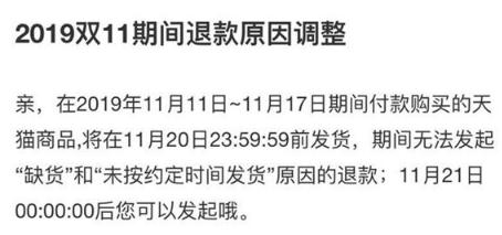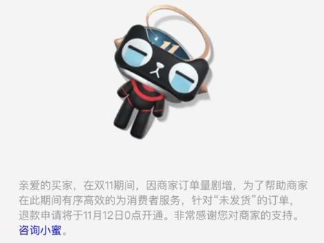 此外,由于太過(guò)火爆,雙十一當天只能買(mǎi)不能退。據天貓淘寶官方公告,雙 11 期間商家訂單量激增,為了幫助商家在此期間有序高效的為消費者服務(wù),針對“未發(fā)貨”訂單,退款申請將于 11 月 12 日 0 點(diǎn)開(kāi)通。