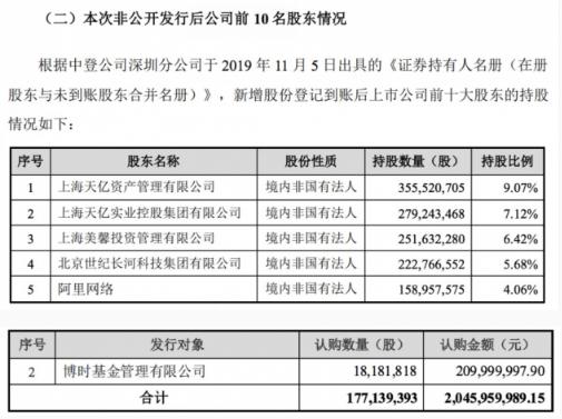 公告顯示,在該次股份轉讓以及本次非公開(kāi)發(fā)行全部完成后,預計阿里網(wǎng)絡(luò )將持有上市公司總股本的 9.39%,杭州信投將持有上市公司總股本的 5.00%,阿里網(wǎng)絡(luò )及其一致行動(dòng)人將合計持有上市公司總股本的 14.39%;與此同時(shí),俞熔將直接持有上市公司總股本的 1.02%,將通過(guò)其控制的天億控股、天億資產(chǎn)、美馨投資和維途投資合計持有上市公司總股本的 12.81%,俞熔的一致行動(dòng)人北京世紀長(cháng)河科技集團 有限公司、高偉及徐可將持有上市公司總股本的 7.34%,俞熔及其一致行動(dòng)人將合計持有或控制上市公司總股本的 21.17%。