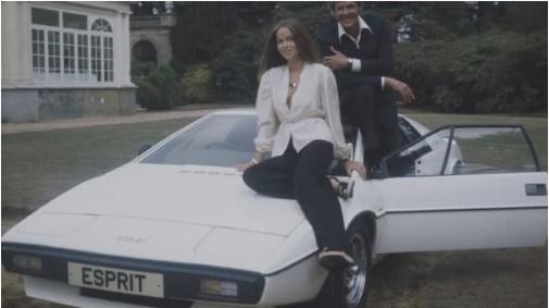 演員芭芭拉·巴赫(Barbara Bach)和羅杰·摩爾(Roger Moore)坐在 1976 年蓮花 Esprit 跑車(chē)上的合影,他們是 007 電影《海底城》的主演