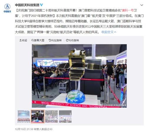 根據國家航天局的消息,2019 年 12 月 15 日,由澳門(mén)特別行政區政府、中央人民政府駐澳門(mén)特別行政區聯(lián)絡(luò )辦公室和國家航天局共同指導的“澳門(mén)星航天情中國夢(mèng)”——慶祝澳門(mén)回歸祖國二十周年航天科普展在澳門(mén)科技大學(xué)開(kāi)幕。
