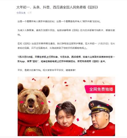 今天,今日頭條官方發(fā)文表示,在和《囧媽》出品方歡喜傳媒溝通后,今日頭條方面爭取到這部賀歲喜劇,在大年初一(1月25日)與大家如約見(jiàn)面,只不過(guò)見(jiàn)面地點(diǎn),從院線(xiàn)換到了手機和智能電視上。