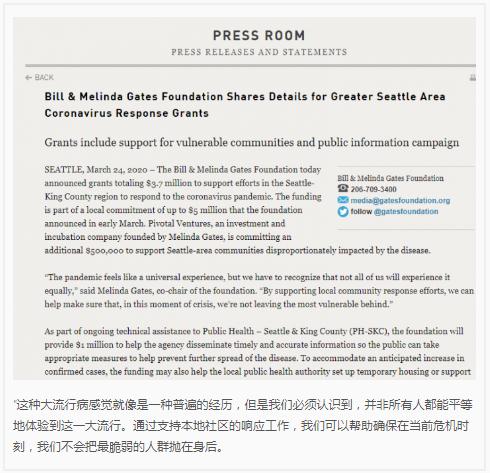 根據在比爾和梅琳達·蓋茨基金會(huì )網(wǎng)站上的一份聲明,這筆捐款將得到充分利用,并確保將錢(qián)發(fā)給最需要的人,100 萬(wàn)美元的資金將幫助公共衛生機構–西雅圖和金縣(PH- SKC)提供準確和最新的信息,以便公眾可以采取適當措施來(lái)幫助防止冠狀病毒的進(jìn)一步傳播。此外,這筆資金還可幫助為非重癥患者和無(wú)家可歸者建立臨時(shí)住房或支持補充服務(wù)。