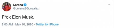5 月 11 日消息,據國外媒體報道,上周末埃隆·馬斯克(Elon Musk)在 Twitter 上宣布將要把特斯拉總部遷出加州后,招致一名加州女議員的不滿(mǎn),其直接在 Twitter 上大罵馬斯克“F**K Elon Musk”。加州女議員羅瑞娜·岡薩雷斯(Lorena Gonzalez)周六晚間發(fā)了這樣一條推文。
