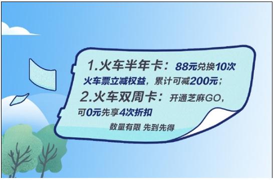 2、火車(chē)雙周卡:開(kāi)通芝麻GO,可0元享4次折扣。