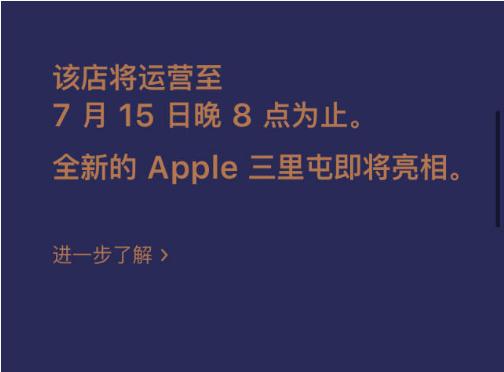 官網(wǎng)顯示,在 7 月 15 日舊店關(guān)閉后,在 7 月 16 日三里屯 Apple Store 會(huì )停業(yè)一天,直到 7 月 17 日新店開(kāi)業(yè),因此如果用戶(hù)有 16 日去店內購買(mǎi)或維修的計劃,可能需要更改一下時(shí)間計劃。
