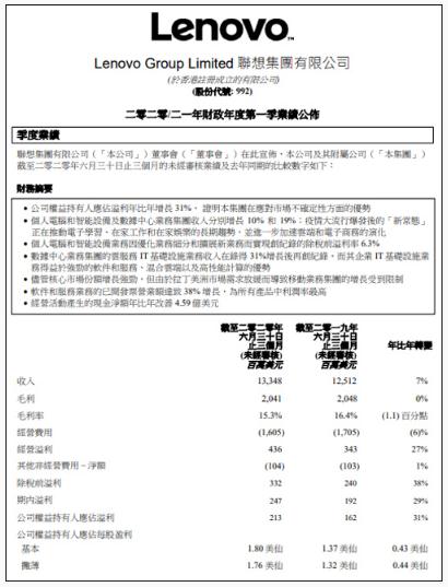 8 月 13 日,聯(lián)想集團(00992.HK)公布截至 2020 年 6 月 30 日的 20/21 財年第一財季業(yè)績(jì)。財報顯示,聯(lián)想集團當季營(yíng)業(yè)額達到 133.48 億美元(約合 946 億人民幣),同比增長(cháng)7%。稅前利潤達到 3.32 億美元(約合 23.5 億人民幣),同比增長(cháng) 38%。凈利潤達到 2.13 億美元(約合 15 億人民幣),同比增長(cháng) 31%。