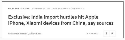 11 月 25 日,兩名知情人士向路透社透露,印度打算從進(jìn)口商品的質(zhì)檢標準入手,嚴格控制來(lái)自中國的電子產(chǎn)品。盡管蘋(píng)果公司在印度有組裝工廠(chǎng),但該公司大部分設備都由中國制造商負責制造,較新機型也在中國組裝。這意味著(zhù),在中國制造生產(chǎn)的 iPhone 12 首當其沖受到波及。