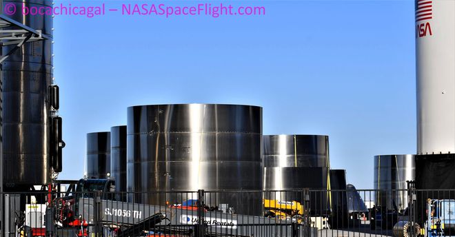 12 月 22 日的航拍照片還顯示,SpaceX 似乎是在一個(gè) 80 米高的高灣內進(jìn)行相關(guān)工作,將屬于超級重型火箭助推器原型 BN1 的兩個(gè)組件堆疊在一起。雖然不可能知道 SpaceX 公司在組裝 BN1 的確切程序,但至少有 12 個(gè)筒身正在堆疊階段,還有更多筒身等待加入主助推器的“堆棧”。