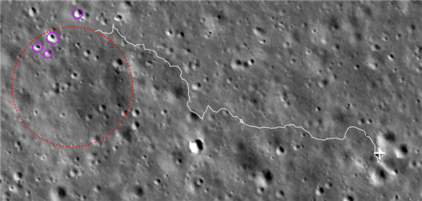 在本月晝期間,玉兔二號將繼續向玄武巖分布區域或反射率較高的撞擊坑區域行進(jìn),這兩個(gè)位置均位于當前探測點(diǎn)西北方向上,距離當前探測點(diǎn)約 27 米,坑南邊存在一處直徑約 160 米的退化撞擊坑。