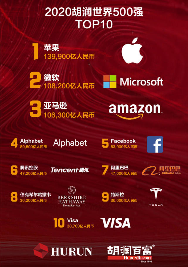 1 月 12 日消息,2020 胡潤世界 500 強榜單于今日發(fā)布。蘋(píng)果公司以 14 萬(wàn)億人民幣價(jià)值成為世界上最值錢(qián)的企業(yè);其次是微軟和亞馬遜,價(jià)值均超過(guò) 10 萬(wàn)億元。Alphabet 排名第四,價(jià)值 8 萬(wàn)億元。世界上四家價(jià)值上萬(wàn)億美元的公司一年內增加了 17 萬(wàn)億元,相當于印度 GDP,總價(jià)值達到 44 萬(wàn)億元,占“胡潤世界 500 強”的 13%。