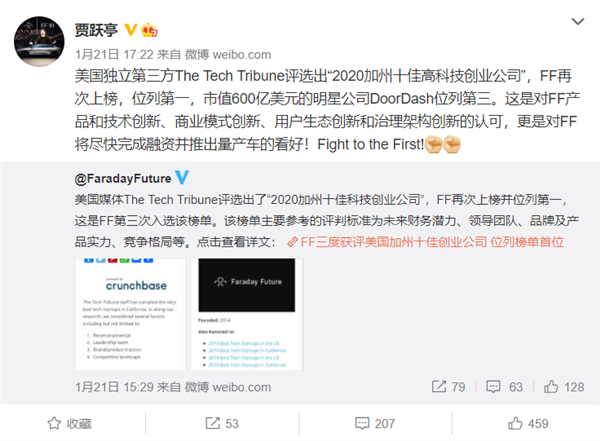 如今,時(shí)隔兩個(gè)月,賈躍亭再次在微博發(fā)聲,稱(chēng) FF(Faraday Future)獲得了,由 The Tech Tribune 評選出了“2020 加州十佳科技創(chuàng )業(yè)公司”,并且名列榜首。
