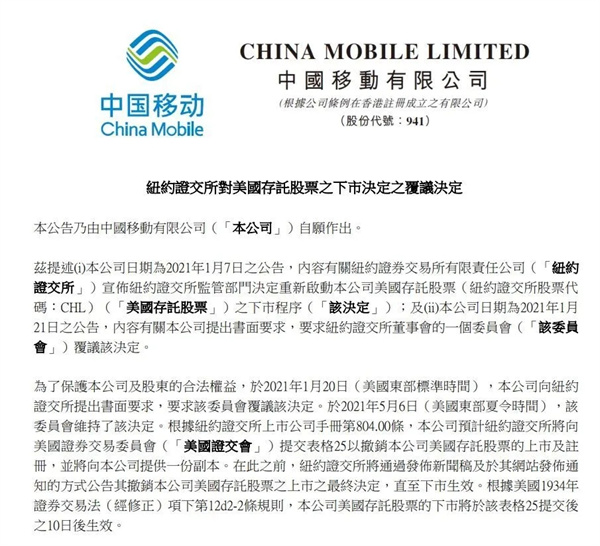 5月7日晚間,三大運營(yíng)商紛紛公告,紐約證交所委員會(huì )維持了紐約證交所監管部門(mén)重新啟動(dòng)本公司美國存托證券ADR下市程序的決定,預計紐約證交所將向美國證券交易委員會(huì )提交25表格以撤銷(xiāo)本公司美國存托證券的上市及注冊(退市)。