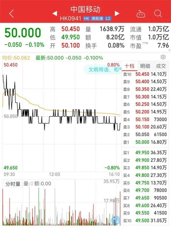 目前中國移動(dòng)的市值為1.02萬(wàn)億港元。