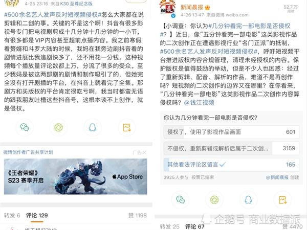 4月26日,新聞晨報發(fā)布微博調查“你認為幾分鐘看完一部電影是否侵權?”,在參與投票的3919人中,有3153人認為這種做法“不侵權”,屬于二次創(chuàng )作。而大眾的評論大致圍繞“快節奏剪輯幫助注水劇集精簡(jiǎn)”、“觀(guān)眾節約時(shí)間”、“剪輯幫助宣傳劇集”等論點(diǎn)表述,更有甚者認為長(cháng)視頻平臺抵制視頻剪輯的行為屬于“得了便宜還賣(mài)乖”。