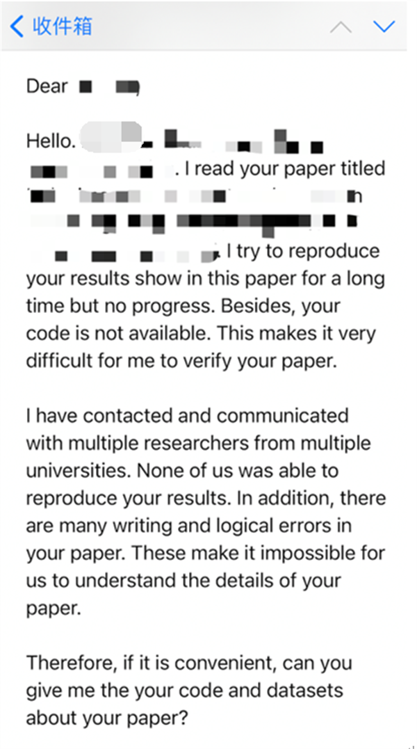 匿名要的,因為擔心作者舉報,通常不會(huì )用實(shí)際單位郵箱而用社會(huì )上的通用郵箱發(fā)送。這些匿名郵件不會(huì )表露出要代碼或者要實(shí)現細節的目的和用途,而是在言辭上拐彎抹角地逼問(wèn)恐嚇,例如指責疑點(diǎn)很多、將舉報論文作者等等??梢坏┳髡邔⒋a或者實(shí)現細節回復匿名者,并詢(xún)問(wèn)對方發(fā)現的具體疑點(diǎn)后,往往就沒(méi)有下文了。