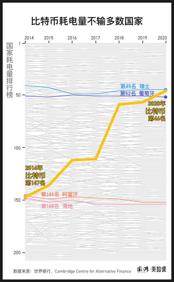 如果把比特幣視作一個(gè)國家,它將位列全球耗電量最大的前 30 國之一。根據劍橋大學(xué)替代金融研究中心的研究,截至 2021 年 5 月 10 日,全球比特幣挖礦的年耗電量大約是 149.37 太瓦時(shí)(1 太瓦時(shí)為 10 億度電),這一數字已經(jīng)超過(guò)馬來(lái)西亞、烏克蘭、瑞典的耗電量,已十分接近耗電排名第 25 名的越南。