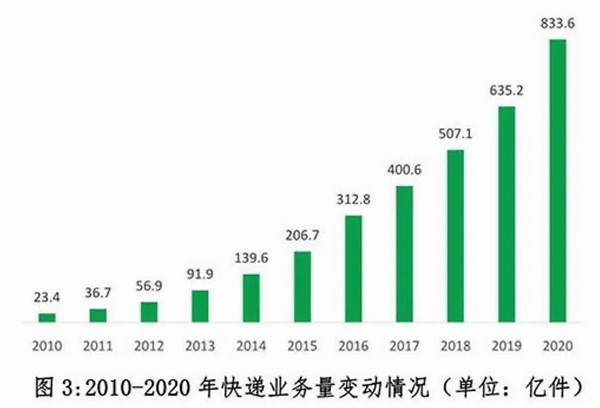 以中國為例,根據國家郵政局發(fā)布的《2020年中國快遞發(fā)展指數報告》,2020年,全國快遞業(yè)務(wù)量達到833.6億件,同比增長(cháng)31.2%。這其中包含的同城、異地、國際/港澳臺快遞業(yè)務(wù)量分別占全部快遞業(yè)務(wù)量的14.9%、82.9%和2.2%。與去年同期相比,同城快遞業(yè)務(wù)量的比重下降2.6個(gè)百分點(diǎn),異地快遞業(yè)務(wù)量的比重上升2.7個(gè)百分點(diǎn),異地業(yè)務(wù)則大多由貨運卡車(chē)完成。