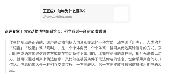 “王豆皮”在提問(wèn)“動(dòng)物為什么要叫”下的回答,得到國家動(dòng)物博物館館長(cháng)、科學(xué)辟謠平臺專(zhuān)家黃乘明的肯定答復的時(shí)刻,是作為動(dòng)物行為愛(ài)好者的他,認為在知乎感受到有獲得感的瞬間。