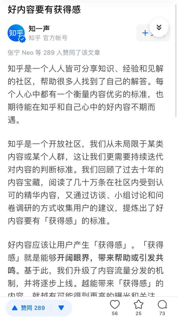 上市后兩個(gè)月后,5月27日,知乎宣布社區內容進(jìn)行結構性升級,社區內容標準及內容分發(fā)機制等都將產(chǎn)生變化,“獲得感”成了知乎衡量?jì)热輧r(jià)值的新標尺。