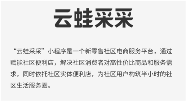 最近,Tech星球發(fā)現,阿里在微信端上線(xiàn)了一款名為“云蛙采采”的小程序。據介紹,云蛙采采是一個(gè)新零售社區電商服務(wù)平臺,通過(guò)賦能社區便利店,解決社區消費者對高性?xún)r(jià)比商品和服務(wù)需求,同時(shí)依托社區實(shí)體便利店,為社區用戶(hù)構筑半小時(shí)的社區生活服務(wù)圈。