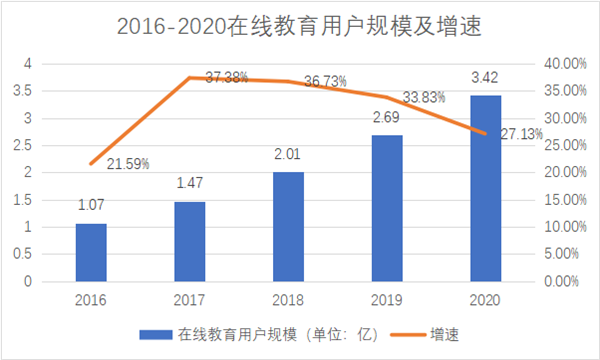 在各個(gè)機構大規模儲備彈藥、短兵相接之時(shí),實(shí)際用戶(hù)拓展的效果并不如人意。據網(wǎng)經(jīng)社電子商務(wù)研究中心聯(lián)合網(wǎng)經(jīng)社教育臺發(fā)布《2020年度中國在線(xiàn)教育市場(chǎng)數據報告》顯示,2020年我國在線(xiàn)教育用戶(hù)規模達到3.42億人,同比增速27.13%為四年來(lái)最低,并且呈逐年下降趨勢。