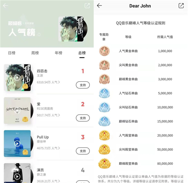 另一方面,打賞的樂(lè )幣數量直接等同于人氣值,反映到人氣排行榜,不同的人氣值還會(huì )讓單曲有不同的認證,充分迎合了粉絲的心理。這或許也是為什么QQ音樂(lè )的打投榜單上排名靠前的都以偶像為主。