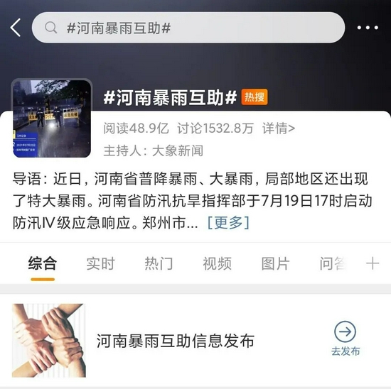 4小時(shí)內,#河南暴雨互助#的話(huà)題閱讀量近50億。